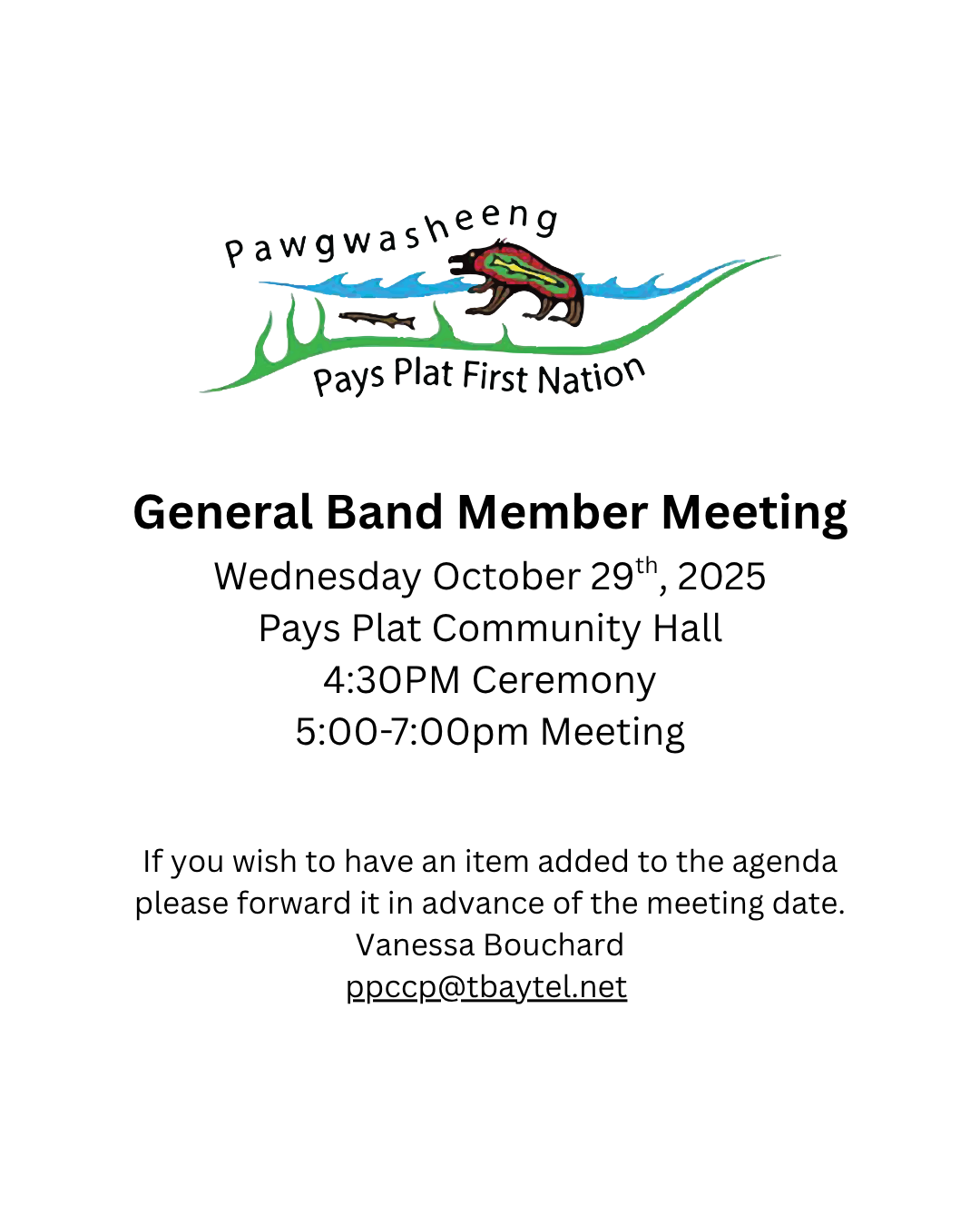 A General Band Member Meeting will take place on Wednesday, October 29th at the Pays Plat Community Hall. If you wish to add an item to the agenda, please forward your request to Vanessa Bouchard (ppccp@tbaytel.net) in advance of the meeting date.
